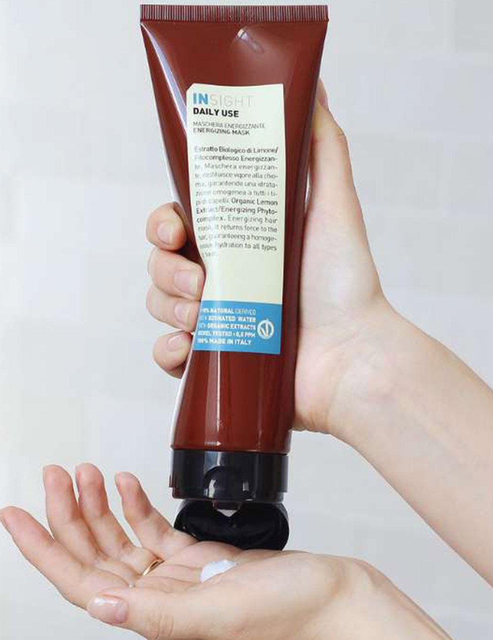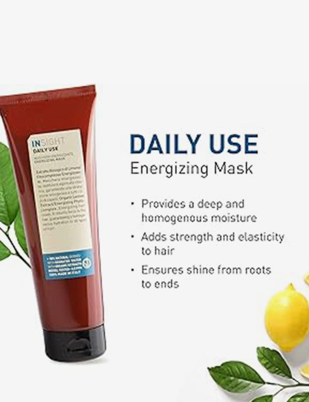 Insight Daily Use Energizing Revitalizing hair mask for a homogeneous hydration, which doesnt weigh down the hair. It returns vitality to the hair, not weighing it down. It detangles hair, leaving it shiny, soft and easier to comb. The fruit acids return strength and elasticity to the hair.