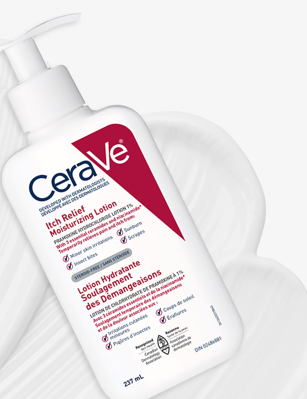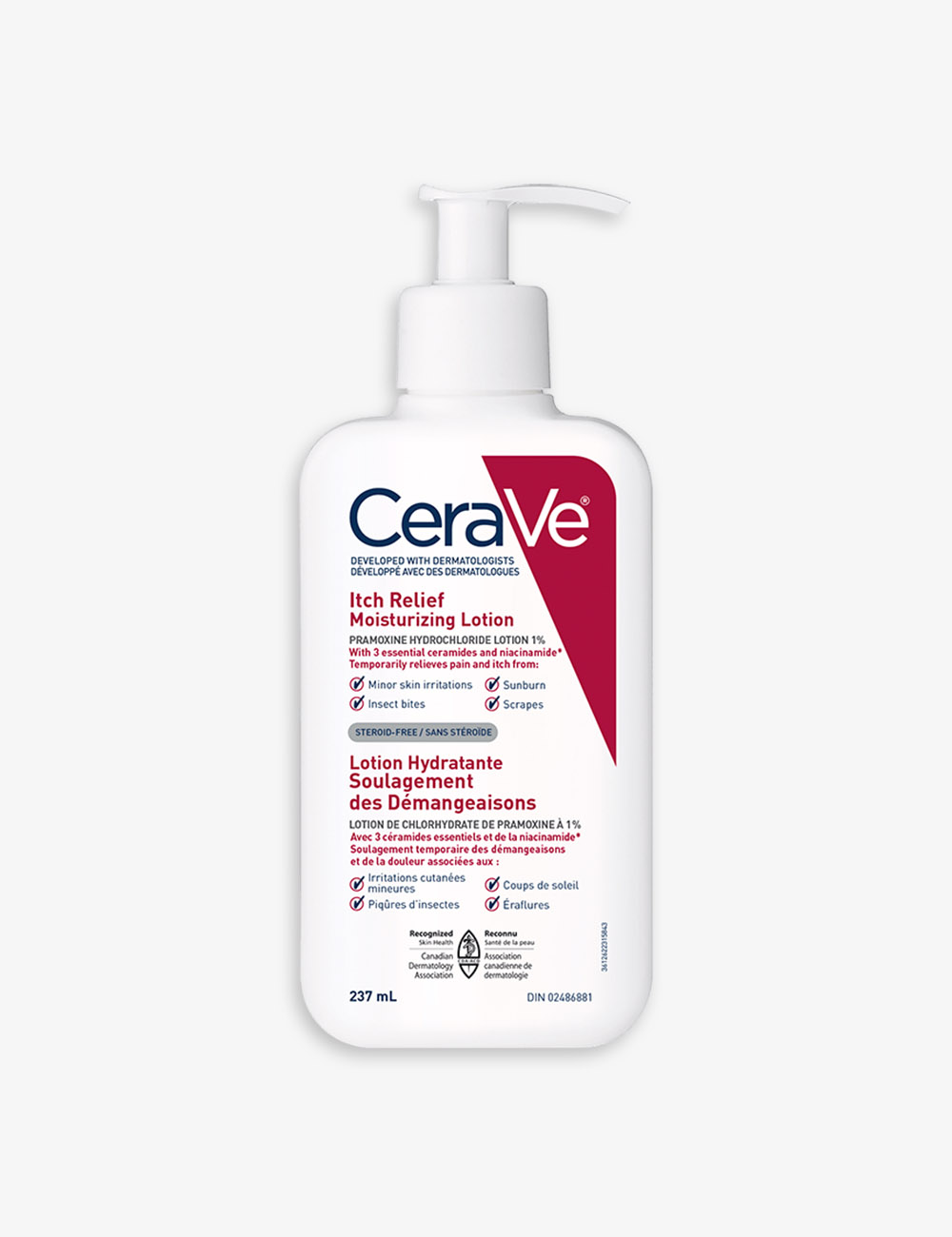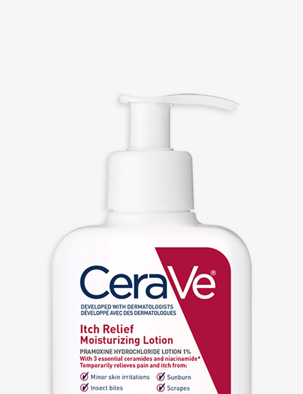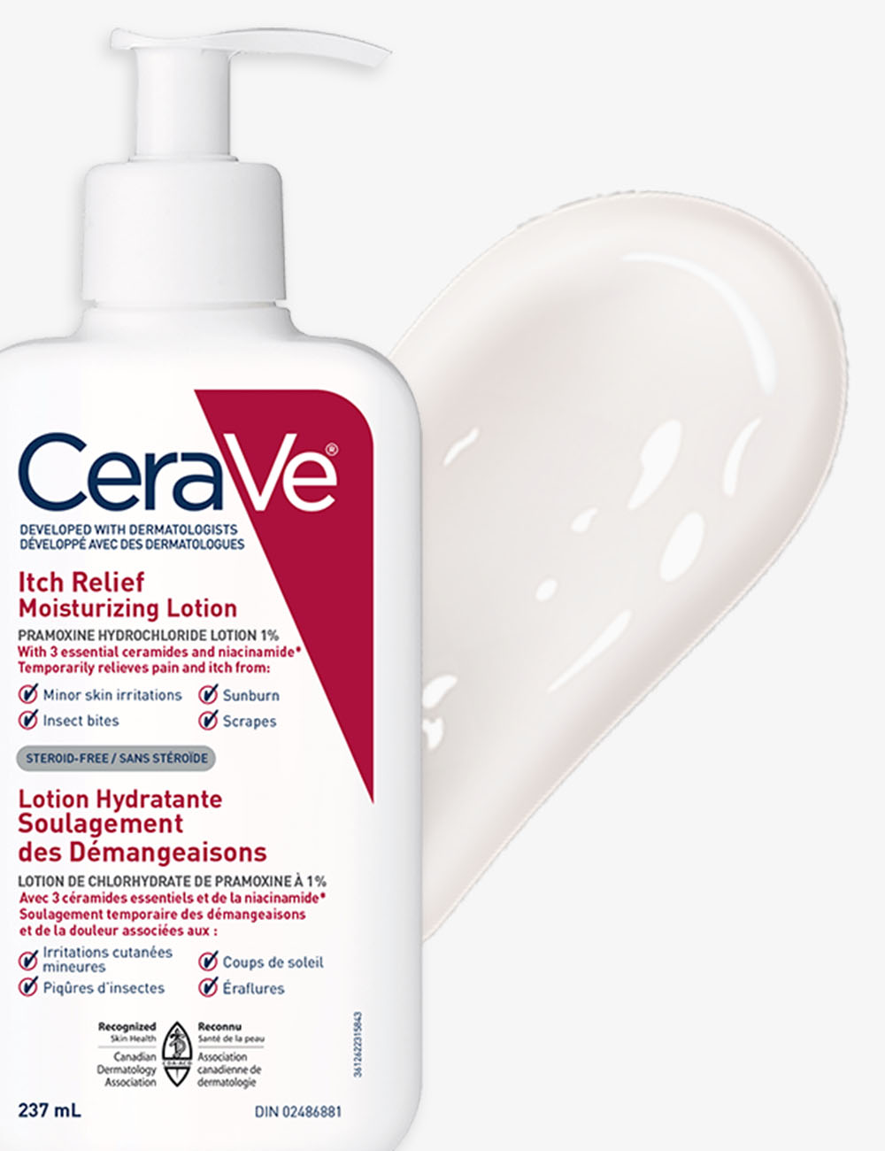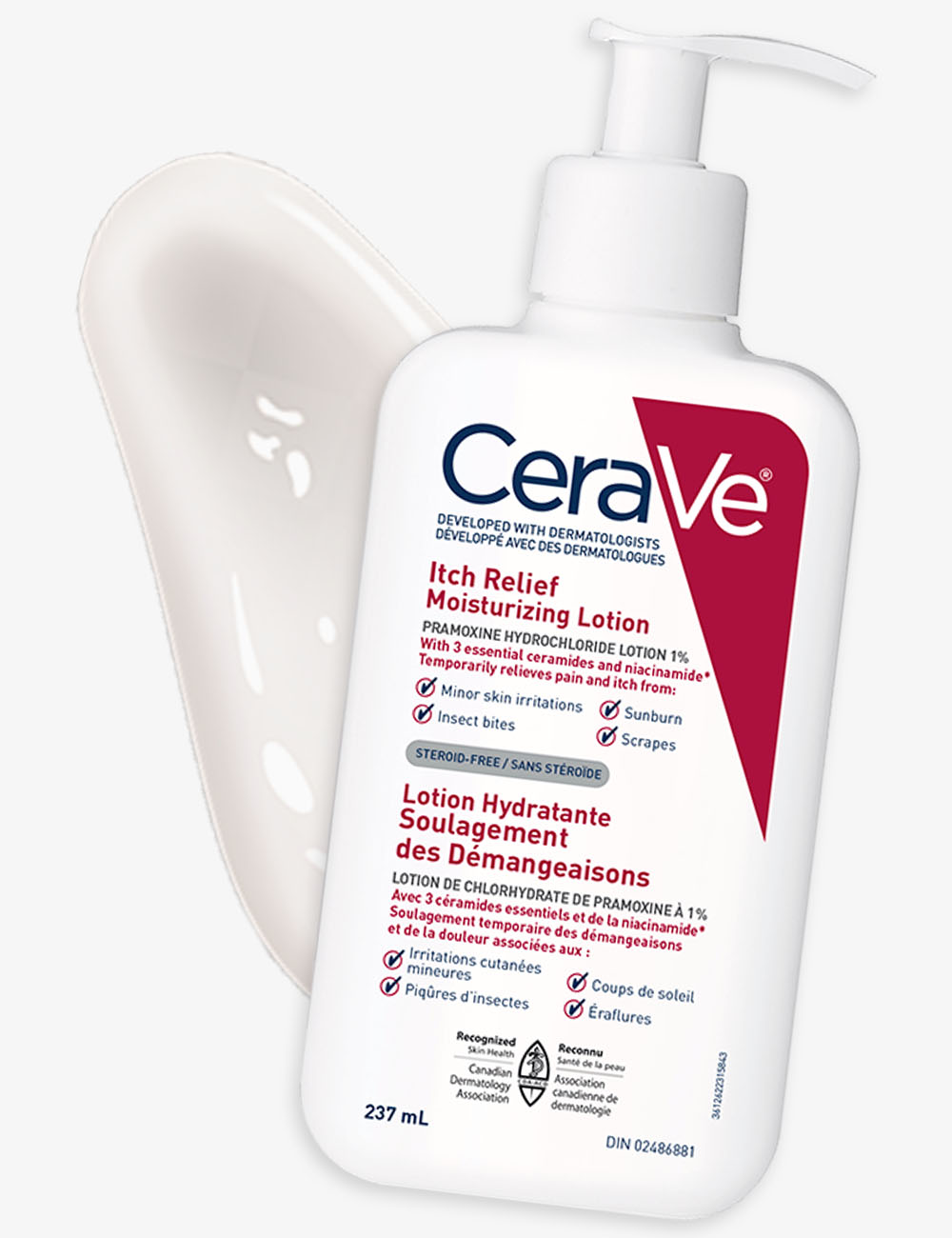 Developed with dermatologists and formulated with the anti-itch ingredient, Pramoxine Hydrochloride 1%, CeraVe Itch Relief Moisturizing Lotion for Dry and Itchy Skin temporarily relieves itching due to insect bites and sunburn, as well as helps soothe dry skin. The formula also contains three essential ceramides (1, 3, 6-II) to help repair and restore the protective skin barrier. The Itch Relief Moisturizing Lotion is steroid-free, fragrance-free and sulfate-free.