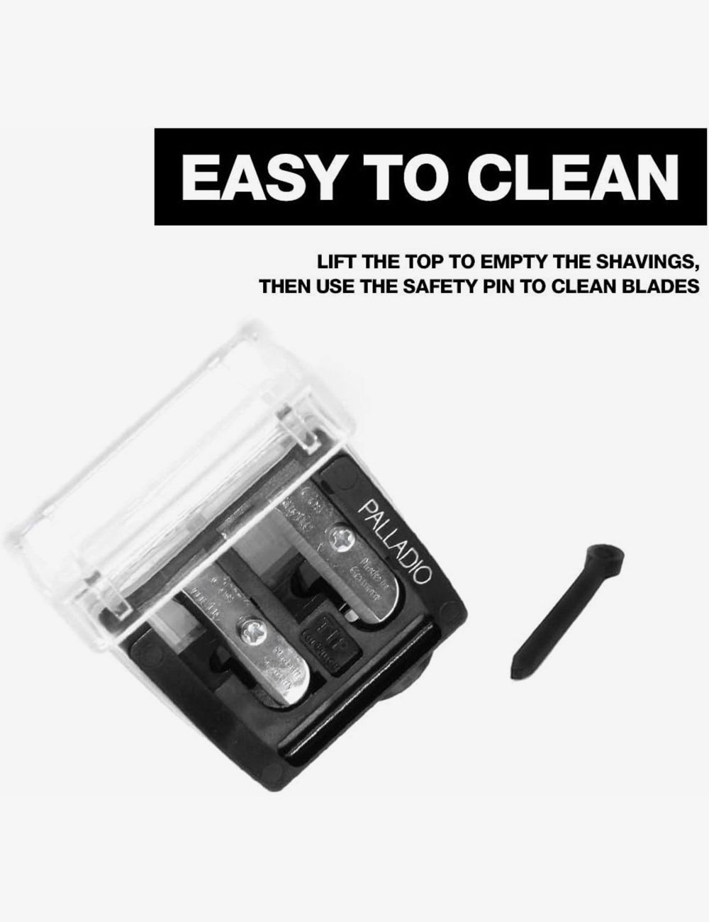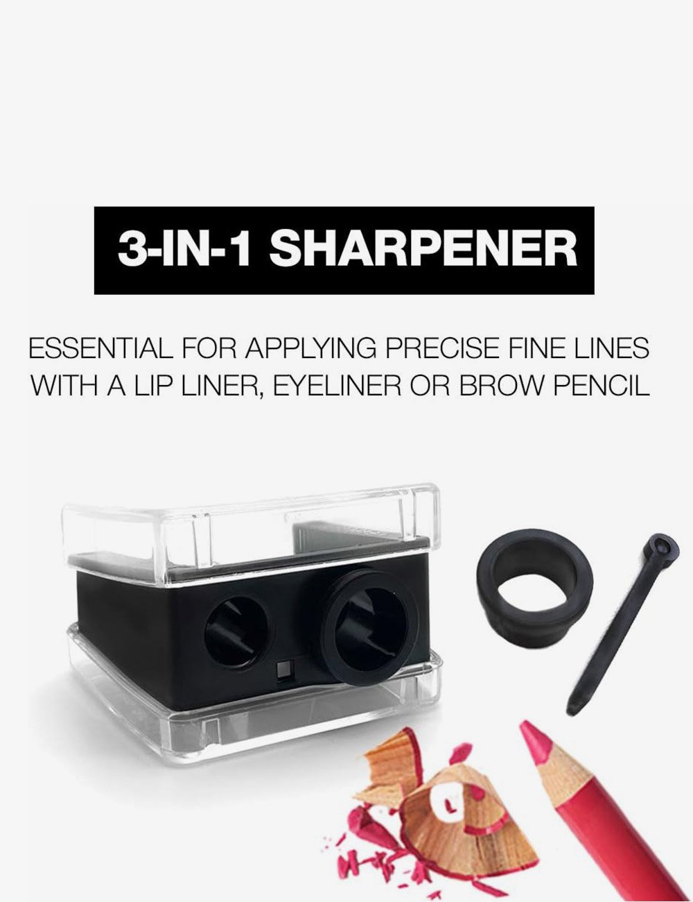 Achieve precision and convenience with the Palladio Double Barrel Pencil Sharpener, the ultimate tool for sharpening your favorite makeup pencils. This versatile 3-in-1 sharpener is designed to sharpen lip liners, eyeliners, and brow pencils with ease, thanks to its convertible barrel design. Crafted with a durable German stainless steel blade, this sharpener ensures precise sharpening without damaging your pencils, giving you perfectly sharpened tips every time. The included protective cover keeps mess at bay, while the plastic pick stick helps clean out hard-to-reach shavings, making maintenance a breeze.