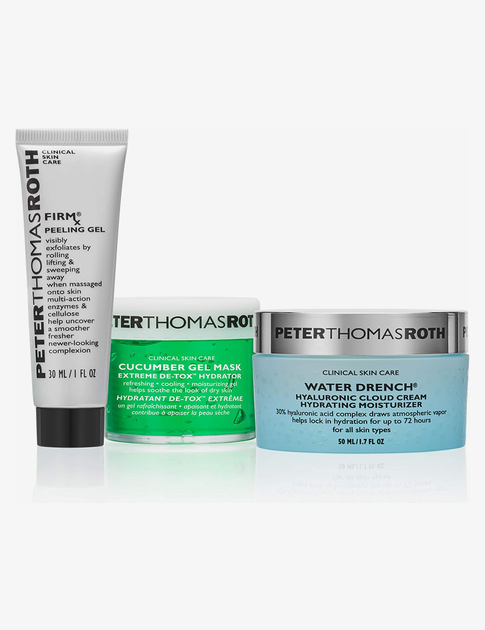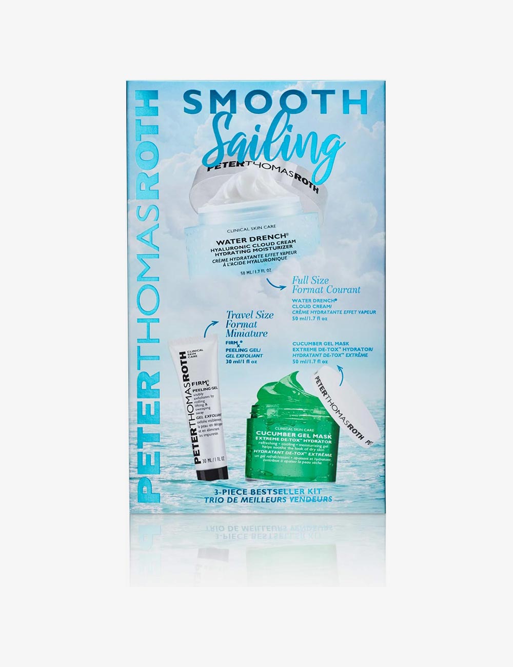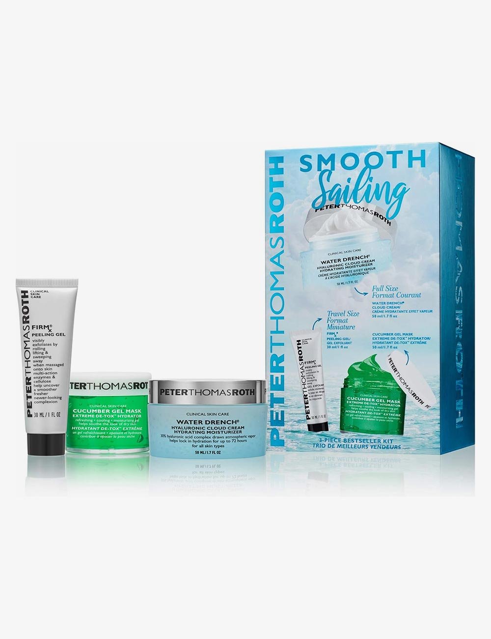 Smooth Sailing 3-Piece Bestseller Kit includes: WATER DRENCH HYALURONIC CLOUD CREAM HYDRATING MOISTURIZER (1.7 fl oz) This concentrated 30% Hyaluronic Acid Complex cream drenches skin with a liquid cloud of pure water vapor and provides up to 72 hours of hydration—even after cleansing. Skin is left feeling silky soft, hydrated and more youthful-looking. FIRMx PEELING GEL (1 fl oz) Exfoliates by gently rolling, lifting and sweeping away the look of impurities when massaged onto skin. Multi-action Pineapple, Pomegranate and Keratinase Enzymes and Cellulose effectively peel to help uncover a smoother, fresher, newer-looking complexion. CUCUMBER GEL MASK EXTREME DE-TOX HYDRATOR (1.7 fl oz) This ultra-gentle gel helps soothe, hydrate and de-tox the look of skin with botanical extracts of Cucumber, Papaya, Chamomile, Pineapple, Sugar Maple, Sugarcane, Orange, Lemon, Bilberry and Aloe Vera. Excellent for soothing the look of skin after sun exposure, peels, waxing, facials and extractions.
