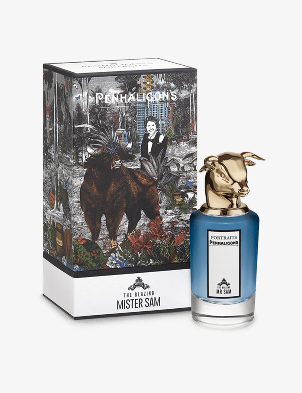 This Penhaligon’s Blazing Mister Sam Eau de Parfum is a blend hot and cold spices. It opens with cardamom, cumin, black pepper intertwined with a cashmere note, tobacco, patchouli and finishes with reverberating, sensual woods. It features a glass bottle with a gold-tone bull head.
